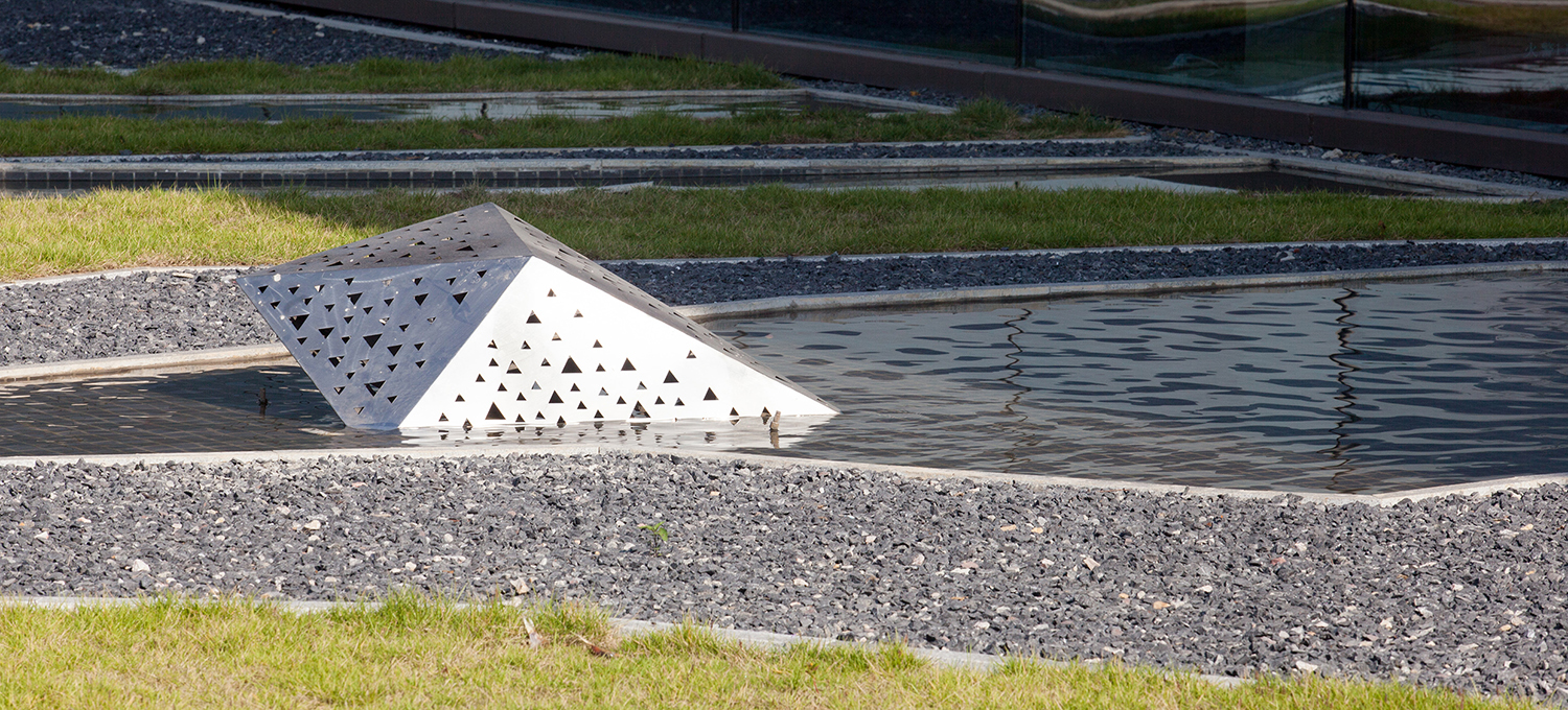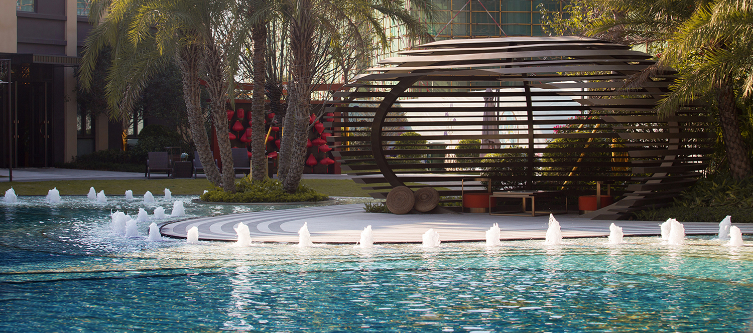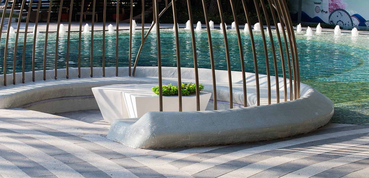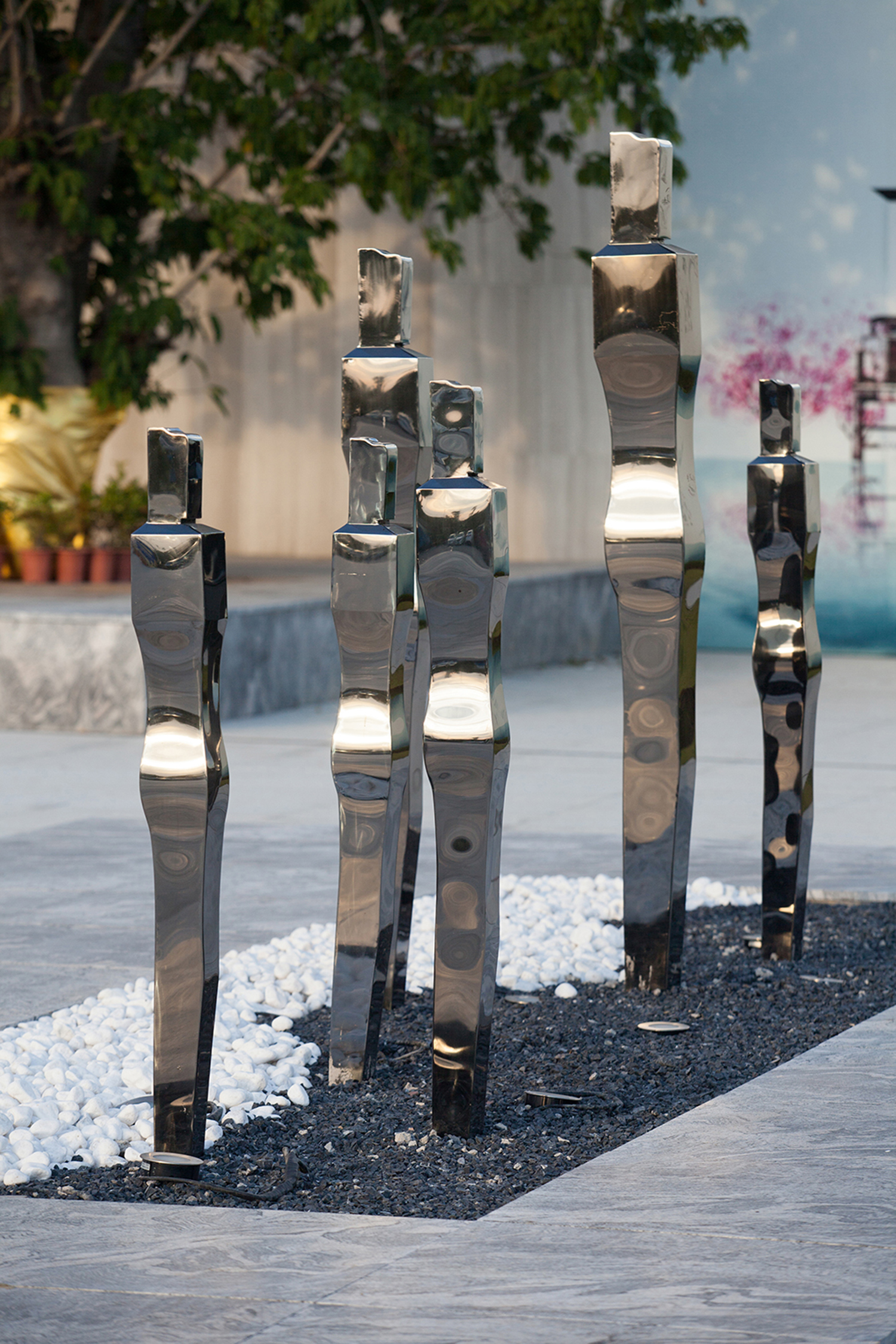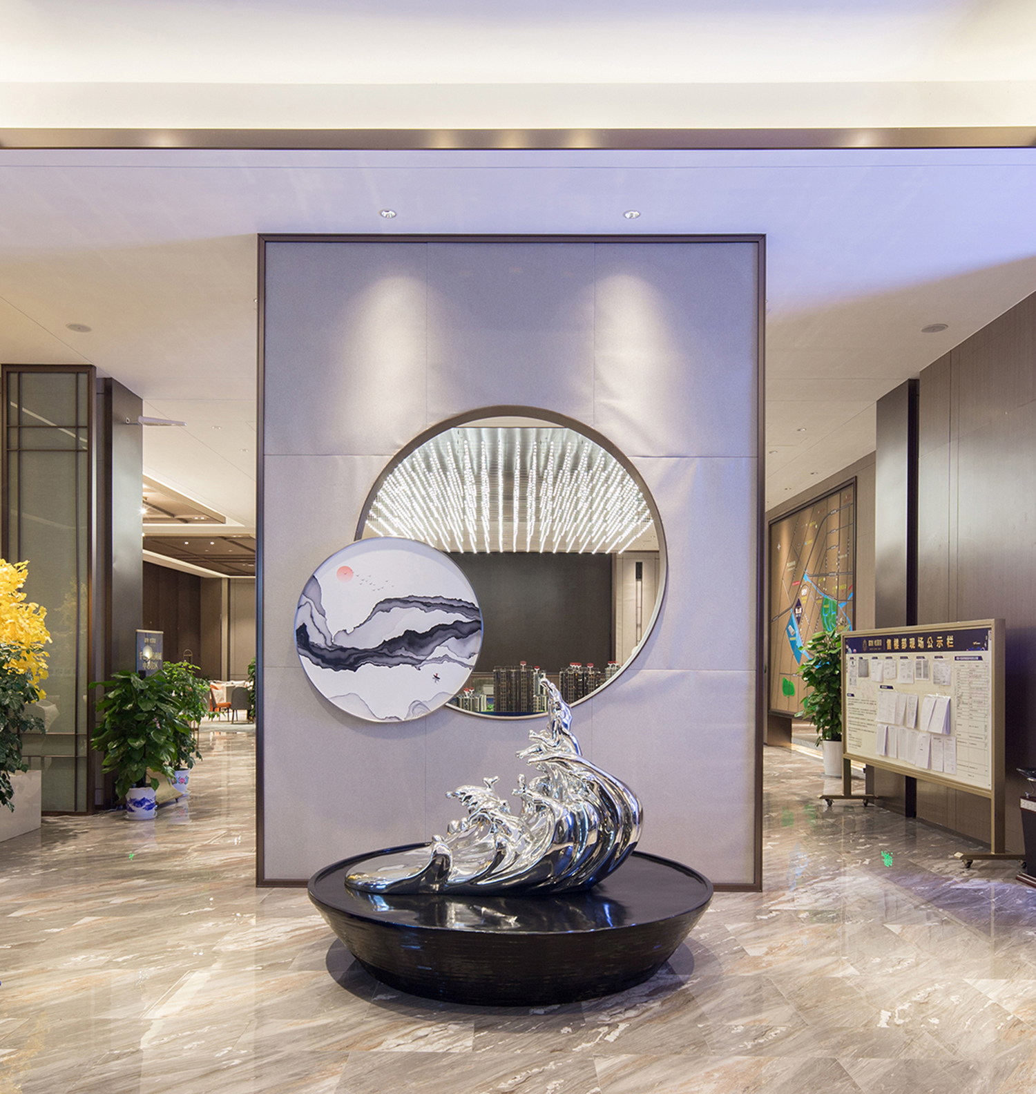 山水(shuǐ)文(wén)脈與現代設計(jì)手法相(xiàng)融合,呈現出不同維度的(de)具象表達,平添趣味性和(hé)體驗度。金(jīn)屬質感的(de)雕塑描摹出山石形态,與“曲折流水(shuǐ)”作伴,描摹出和(hé)諧的(de)人(rén)文(wén)雅趣之境。