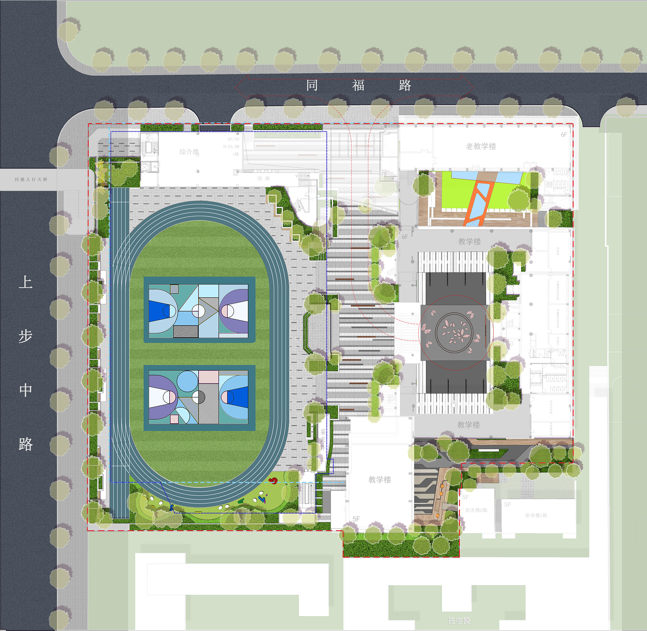 DNA(為英文(wén)Deoxyriboucleic acid的(de)縮寫)是脫氧核糖核酸,它是一種生物(wù)大(dà)分(fēn)子,可(kě)組成遺傳指令,引導生物(wù)發育與生命技能(néng)運作,主要功能(néng)是信息儲存。同時提取深圳市花三角梅的(de)花瓣元素,簡化抽象處理(lǐ),使其成為景觀設計中的(de)特色圖案,將其堅韌不拔、頑強奮進的(de)精神融匯到(dào)學校(xiào)中。
