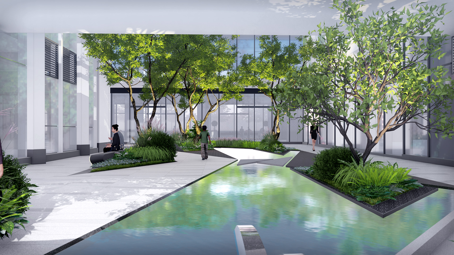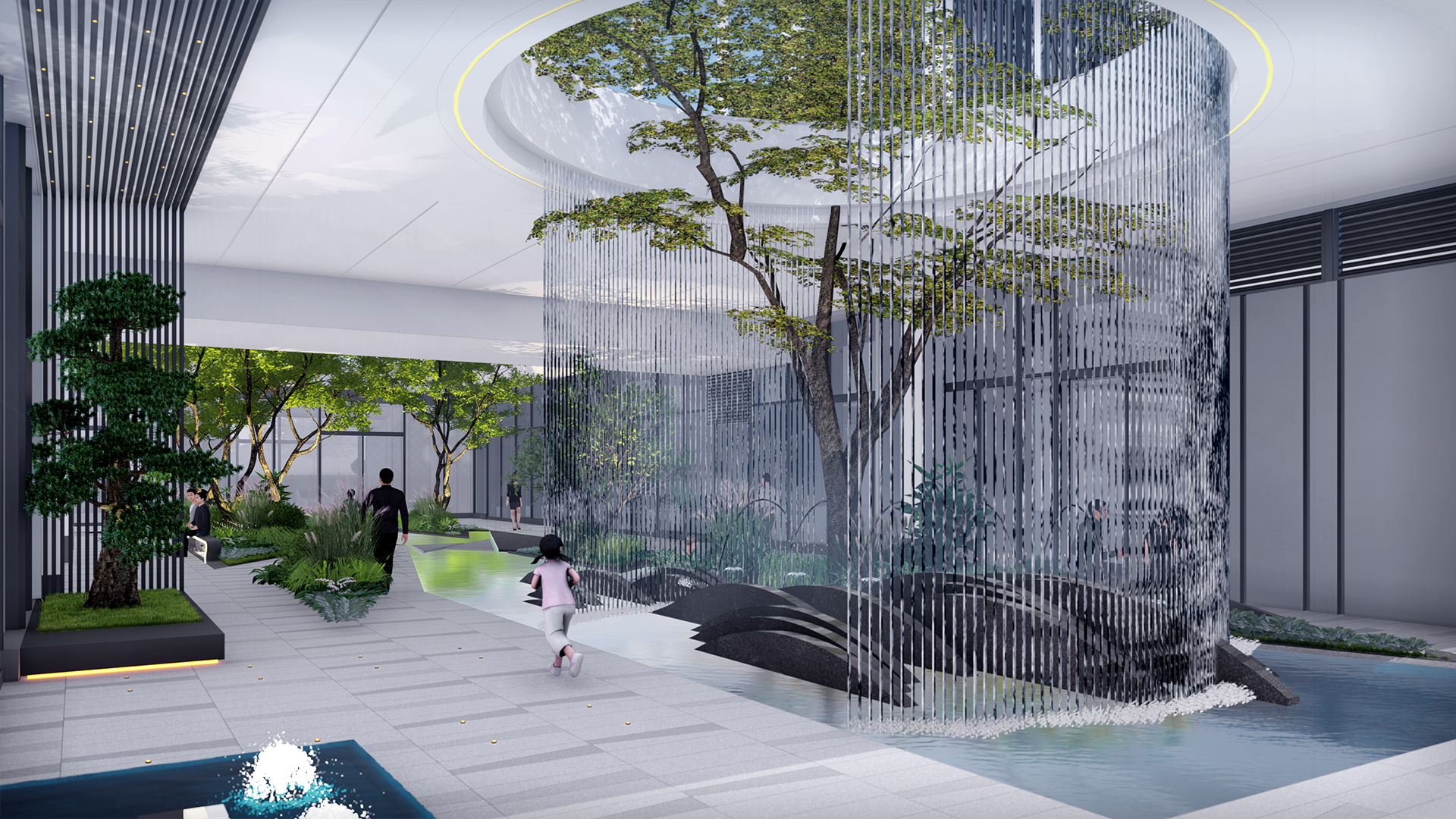 中庭設計(jì)模拟海(hǎi)上(shàng)絲綢之路(lù)東海(hǎi)與海(hǎi)港之間形成的(de)折線與三角關系,通過連續明(míng)快的(de)折線設計(jì)語彙,形成富有(yǒu)韻律、多維延伸的(de)空間界面;在此植入“森林”,感受自然間熱(rè)帶雨林的(de)藝術(shù)。